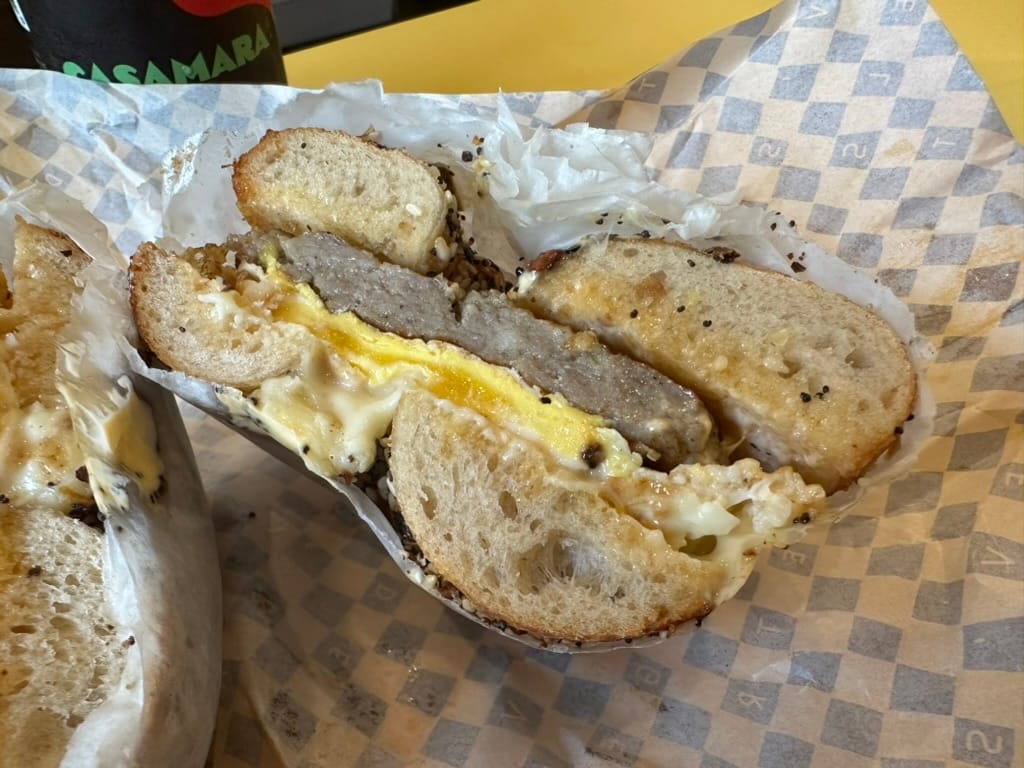 "Over My Egg Body" has fried egg, cooper sharp cheese, and spicy mayo. I upped it with breakfast sausage on an Everything bagel.