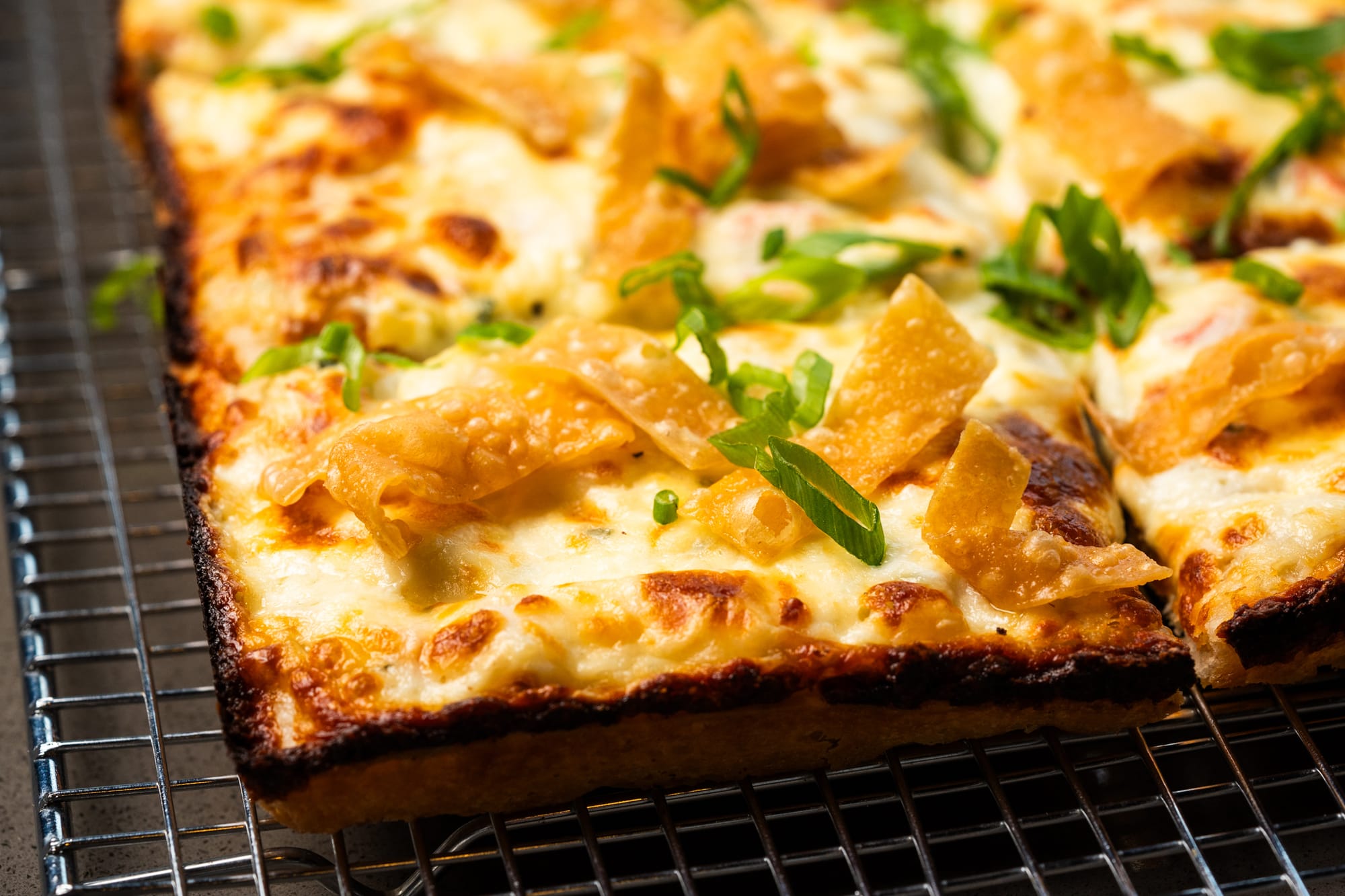 The menu focuses on Detroit-style pizza, offering unique options like coney-inspired and crab rangoon pizzas, alongside classics like Margherita and Spicy Pepperoni.