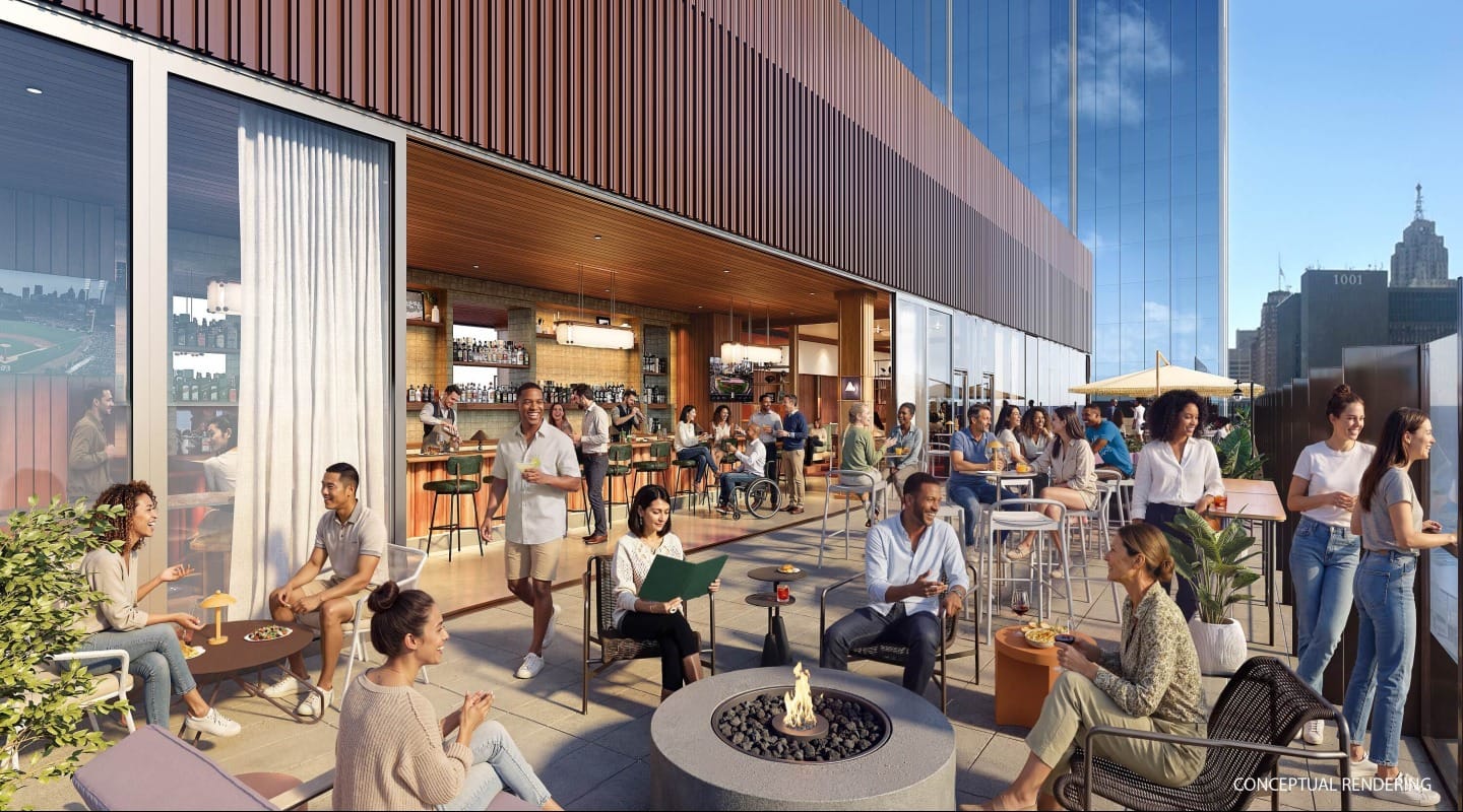 According to renderings it looks out over Comerica Park, Woodward Avenue, and the Detroit skyline.