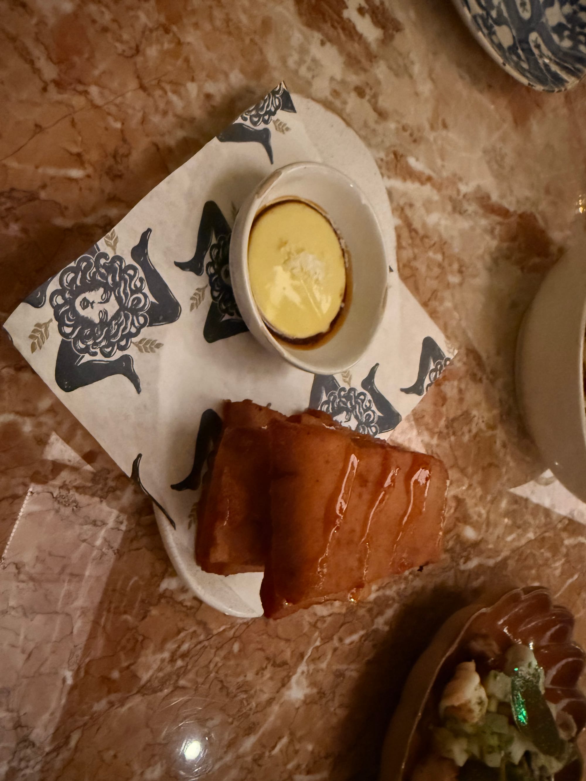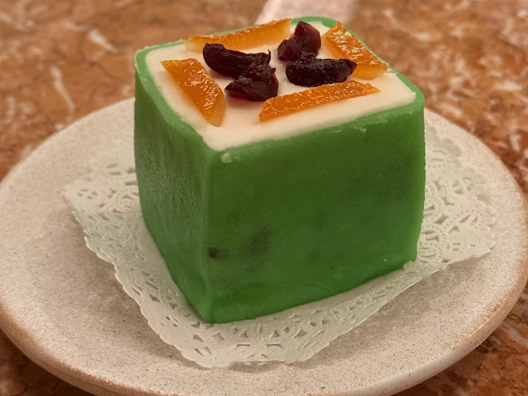 It consisted of layers of delicate chiffon cake and chocolate-studded ricotta mousse wrapped in bright green marzipan and topped with candied fruits. It was sweet, but not too sweet — the bitter candied orange helped — and was a perfect sweet treat to finish the night.