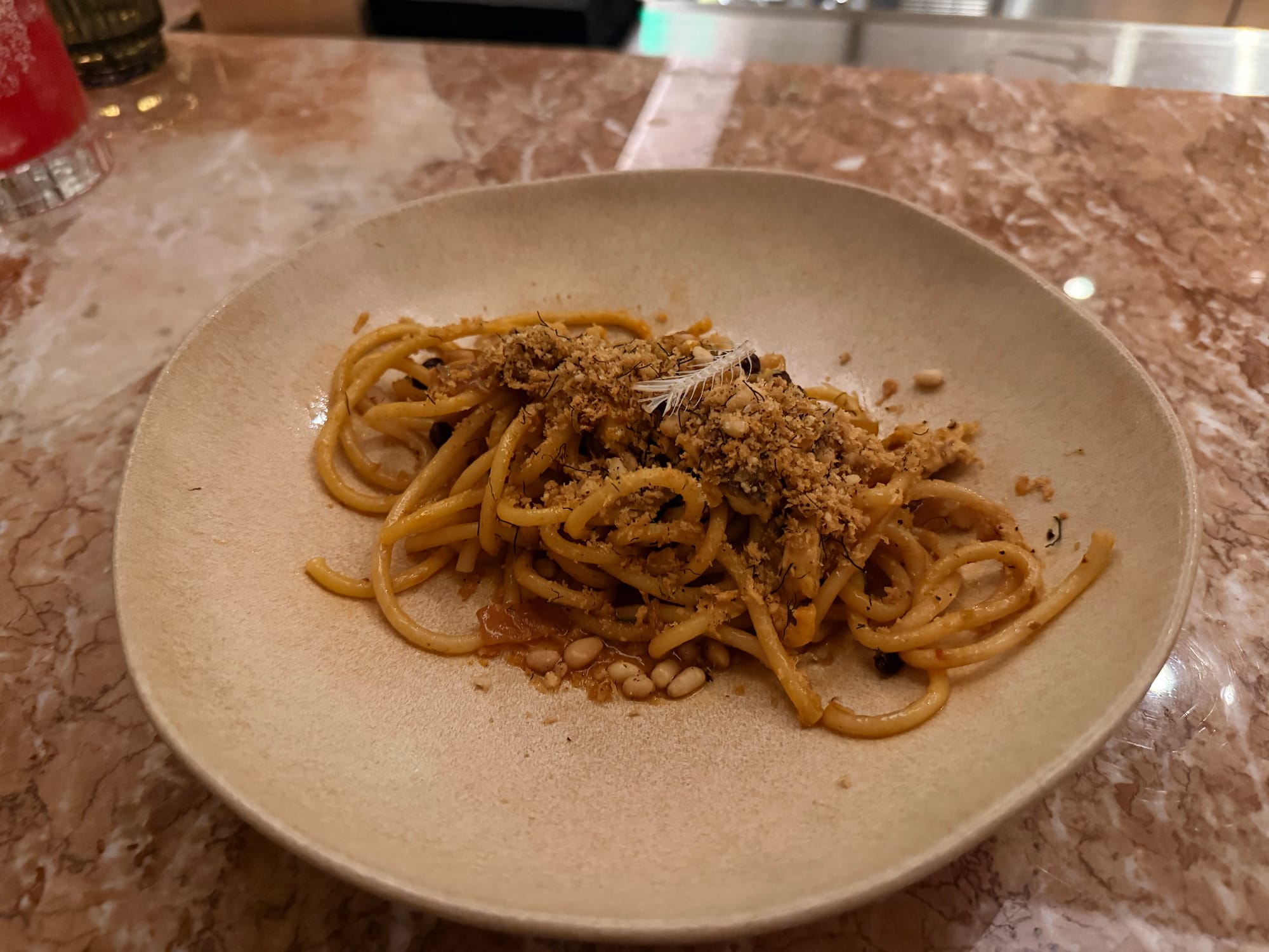 Bucatini is a thick, hollow spaghetti (think cocktail straw) and it was perfectly cooked — gently chewy while the grilled sardines were delicate and flaky. The dish had Sicilian flavors of fennel and saffron, and crunch was provided by a pine nut crumble.