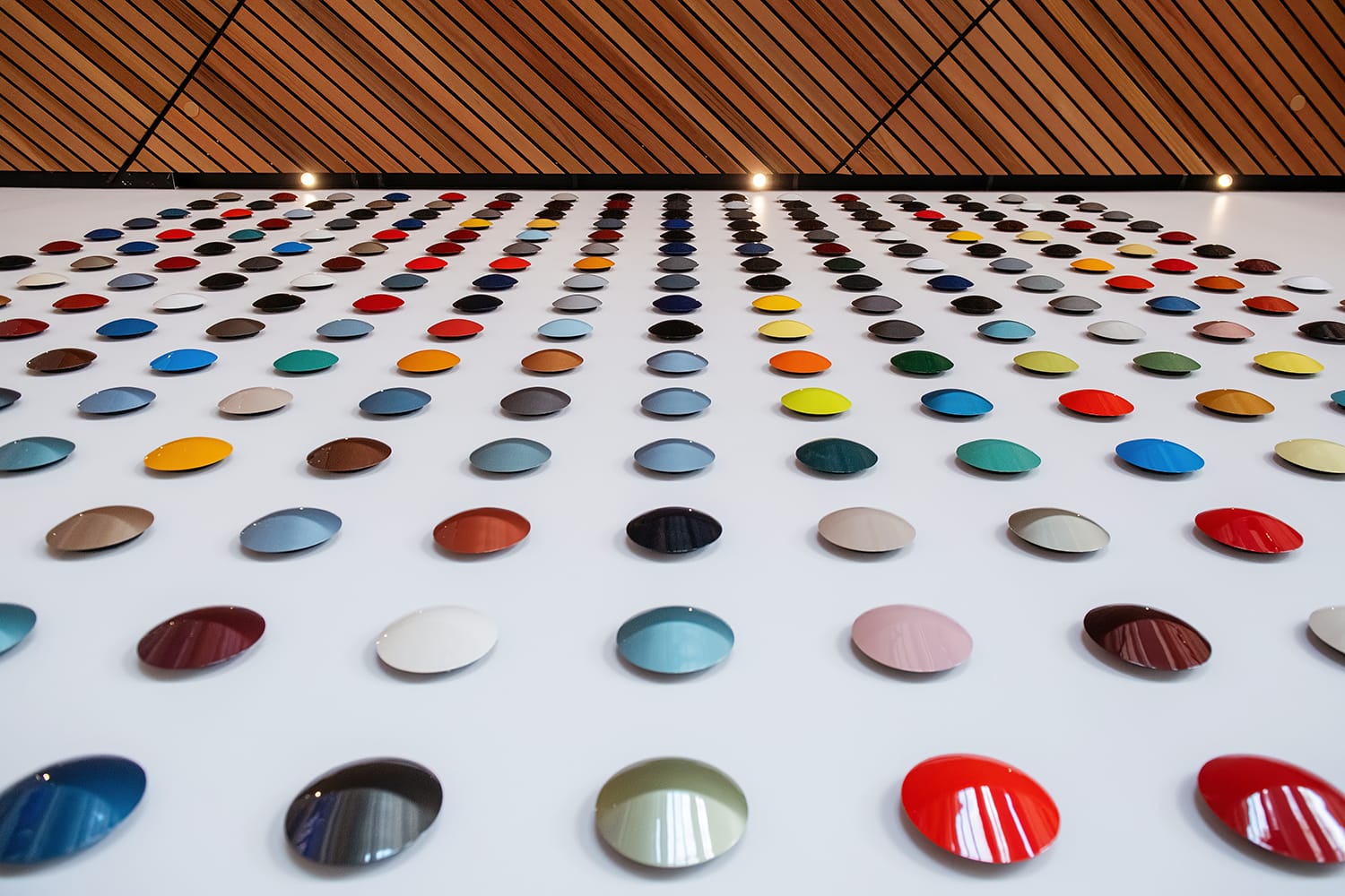 There are ten turntables, a digital screen that spans 64 feet across, a conference room that can be made private at the flip of a switch with frosted glass, a courtyard outside to look at vehicles in the actual outdoor light, and it’s all connected to the colors and materials display area.