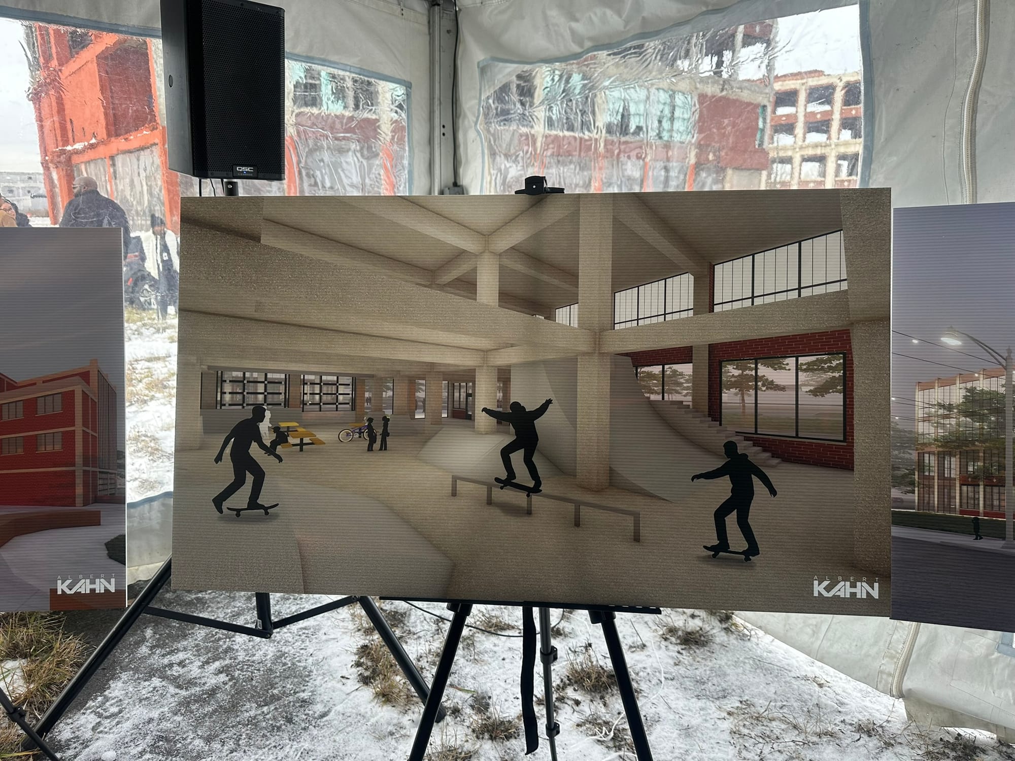 An existing Albert Kahn‑designed structure on the site would be rehabbed into 42 affordable live‑make units, Detroit’s first indoor skate park and MODEM — the Museum of Detroit Electronic Music — along with more than two acres of indoor‑outdoor public and recreation space.