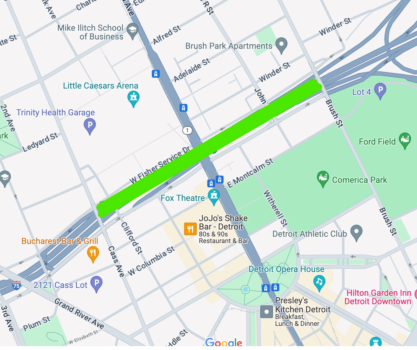 But it could add some park space, create more walkability as crossing freeway overpasses on foot isn’t fun. It might also hide what is a loud, noisy freeway section that cuts right through downtown, benefitting the Brush Park neighborhood.