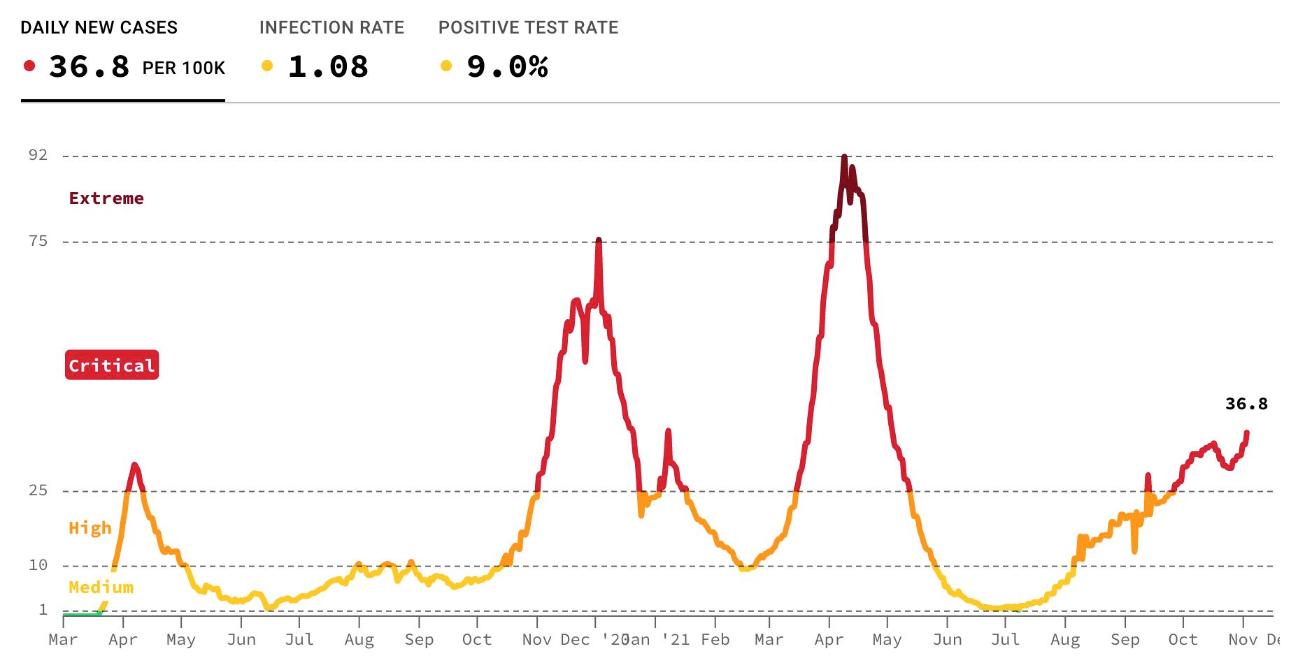 Do what you want with this information, but COVID cases and hospitalizations are back on the rise in Metro Detroit after we thought we might see a real downturn a month ago. This rise is happening across Michigan and other cold-weather states. Via COVID Act Now: